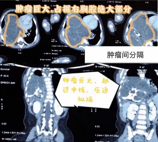 一周前,小彤彤因?yàn)闅獯?、呼吸困難、惡心在當(dāng)?shù)蒯t(yī)院就診,胸片檢查提示隔膨升可能,為了明確診斷來(lái)到哈爾濱市兒童醫(yī)院心胸外科就診。戚家峰副主任為孩子進(jìn)一步進(jìn)行查體考慮是縱隔腫瘤,通過(guò)胸部CT增強(qiáng)造影檢查更加清晰的看到腫瘤的特殊性,該腫瘤幾乎占滿右側(cè)胸腔,縱隔被擠壓后導(dǎo)致移位,心臟、食管均有不同程度的受壓影響。而且這個(gè)巨大的腫瘤由很多分隔組成,分隔中含有的物質(zhì)又不同,有囊性組織、實(shí)性組織和鈣化組織,考慮畸胎瘤可能。