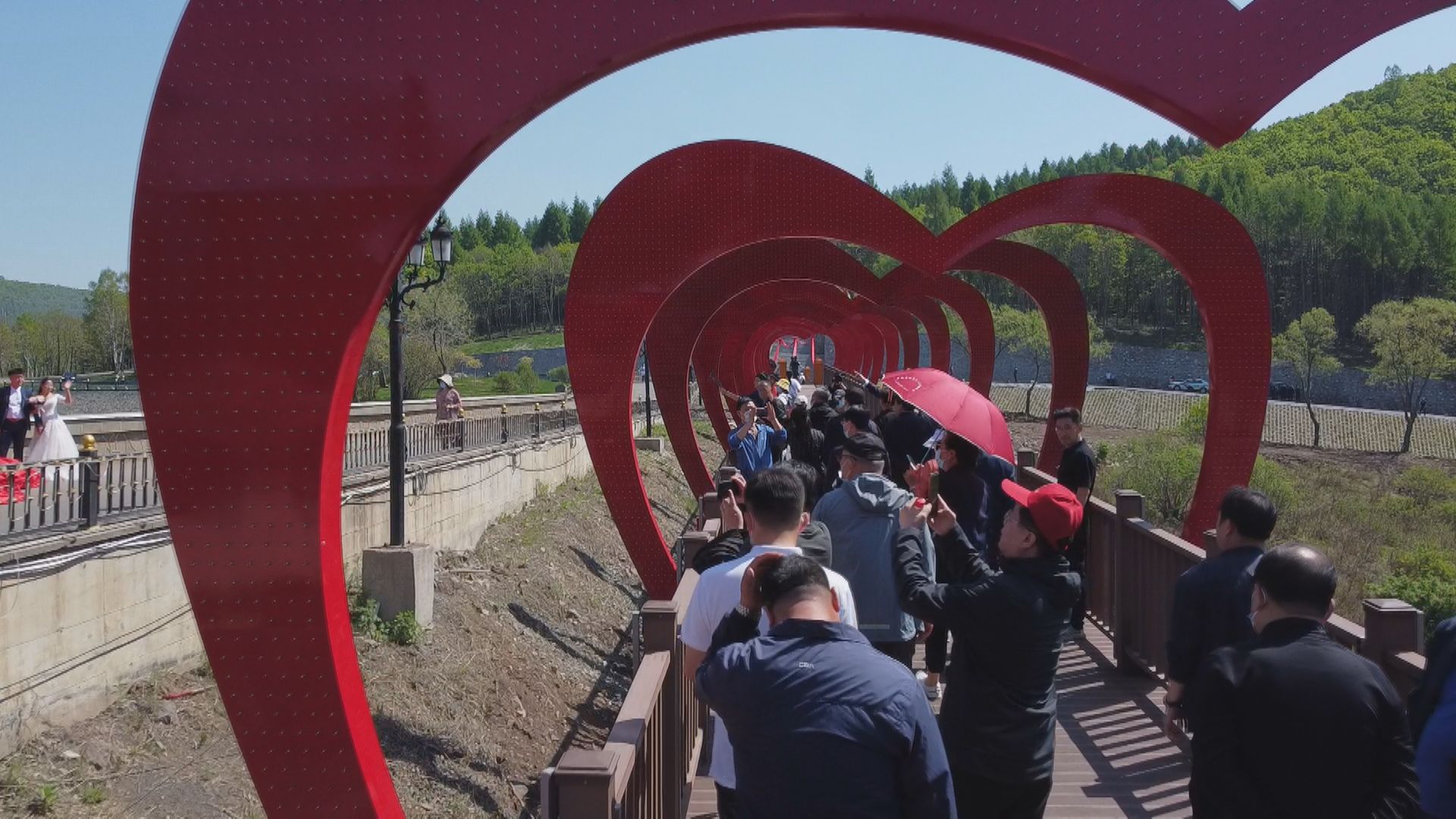 5月的邊城,清風(fēng)拂面,陽光明媚。位于天長(zhǎng)山與地久山間的愛情谷公園湖水清澈,美景如畫。這里東經(jīng)131度,北緯44度,海拔520米,加在一起正是“一生一世我愛你”的諧音,這也是公園名字的由來。