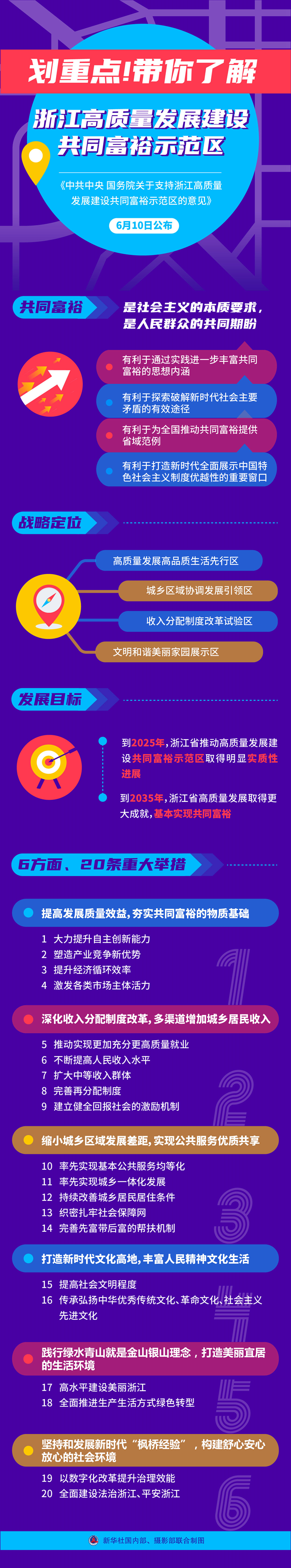 《中共中央 國務院關于支持浙江高質量發(fā)展建設共同富裕示范區(qū)的意見》10日發(fā)布。共同富裕示范區(qū)有哪些亮點?提出了哪些重大任務?如何讓共同富裕看得見、摸得著、真實可感?打開這張圖,帶你了解浙江高質量發(fā)展建設共同富裕示范區(qū)。(新華社記者謝希瑤 安蓓 制圖 陳為)