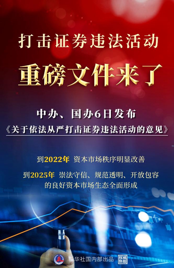 新華社北京7月6日電(記者張千千 劉慧)中共中央辦公廳、國務(wù)院辦公廳6日公開發(fā)布了《關(guān)于依法從嚴(yán)打擊證券違法活動(dòng)的意見》,對建立健全資本市場執(zhí)法司法體制機(jī)制、依法從嚴(yán)打擊證券違法活動(dòng)、推動(dòng)資本市場高質(zhì)量發(fā)展作出重要部署。