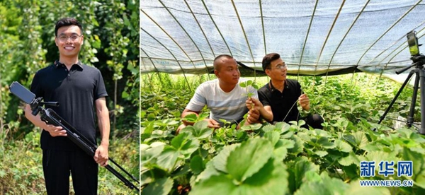 拼版照片:左圖為張成蘊(yùn)在山西省運(yùn)城市絳縣臨澮村的田間;右圖為張成蘊(yùn)(右)在大棚里錄制農(nóng)業(yè)科普視頻(7月14日攝)。今年34歲的張成蘊(yùn)大學(xué)畢業(yè)后,一直熱衷于用拍攝視頻的方式宣傳家鄉(xiāng)的風(fēng)土人情。2018年8月,他開始在社交平臺(tái)上幫助鄉(xiāng)親們直播帶貨,真誠(chéng)的笑容、優(yōu)質(zhì)的產(chǎn)品和專業(yè)的知識(shí)是他吸引粉絲的“訣竅”。