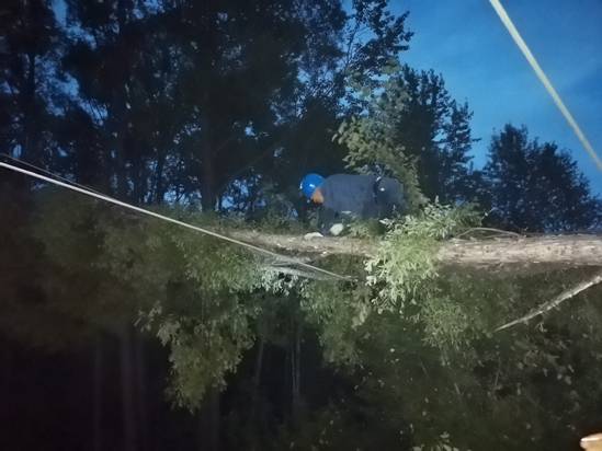 飛機(jī)巡查發(fā)現(xiàn)的呼碧線128號(hào)電線桿和129號(hào)電線桿之間線路故障處,由呼中輸電運(yùn)檢班組負(fù)責(zé)搶修,需搶修人員步行穿過密林和水道,經(jīng)過1個(gè)多小時(shí)的艱難跋涉方能到達(dá),現(xiàn)場(chǎng)電線上掛著一棵直徑40多厘米的風(fēng)倒樹,導(dǎo)致電線破損,搶修人員將風(fēng)倒樹用手鋸切割移除,并對(duì)破損電線進(jìn)行補(bǔ)強(qiáng),截至21時(shí)30分,呼碧線兩處故障全部搶修完畢,呼中區(qū)陸續(xù)完成供電。