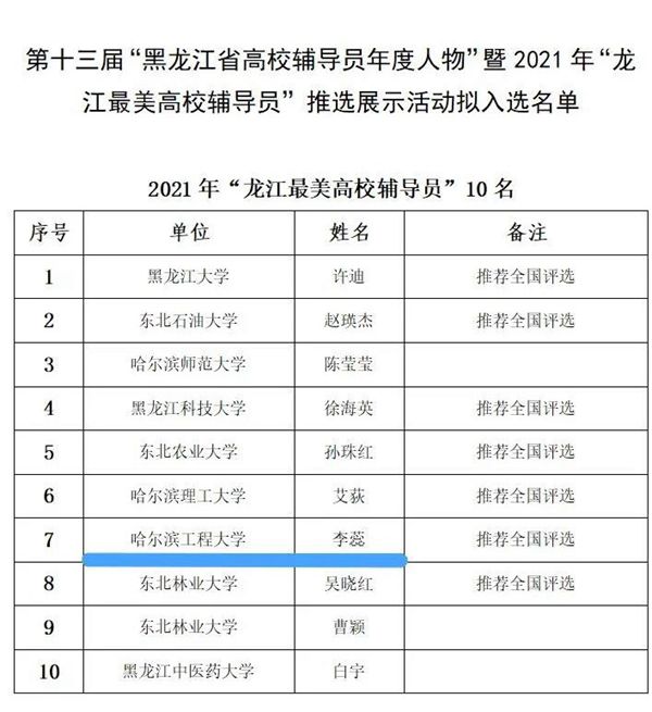 此次活動共評選出“第十三屆黑龍江省高校輔導(dǎo)員年度人物”11名,“2021年龍江最美高校輔導(dǎo)員”10名。哈工程輔導(dǎo)員梁艷艷、李蕊憑借高水平的專業(yè)能力、優(yōu)異的工作業(yè)績以及認真負責(zé)的工作精神,在眾多評選者中脫穎而出。