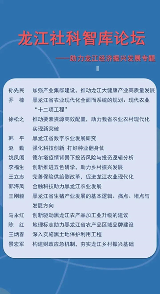 來自省內(nèi)高校、科研院所、企業(yè)的14位專家學(xué)者在會上圍繞“助力龍江經(jīng)濟振興發(fā)展”這一主題,分別就“加強產(chǎn)業(yè)集群建設(shè),推動龍江大健康產(chǎn)業(yè)高質(zhì)量發(fā)展”“黑龍江省農(nóng)業(yè)現(xiàn)代化全面而系統(tǒng)的規(guī)劃:現(xiàn)代農(nóng)業(yè)‘十二項工程’”“推動要素資源高效配置,助力我省農(nóng)業(yè)農(nóng)村現(xiàn)代化實現(xiàn)新突破”“黑龍江省數(shù)字農(nóng)業(yè)發(fā)展研究”等主題進行了發(fā)言。