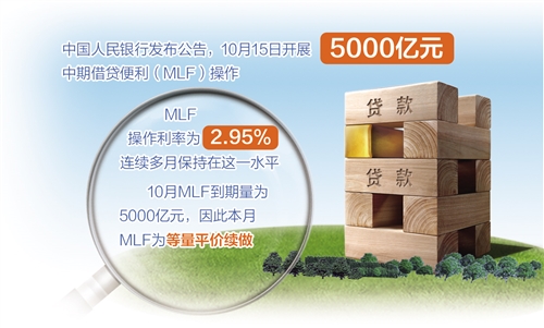 10月15日,月中“麻辣粉”(MLF)如期端出。中國人民銀行發(fā)布公告稱,為維護(hù)銀行體系流動性合理充裕,15日開展5000億元中期借貸便利(MLF)操作(含對10月15日MLF到期的續(xù)做)。MLF操作利率為2.95%,與9月持平,并連續(xù)多月保持在這一水平。10月MLF到期量為5000億元,因此本月MLF為等量平價續(xù)做。