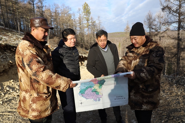 圖為阿木爾林業(yè)局黨委副書記、局長(zhǎng)韓鳳泉(右二)深入到2—1線檢查新開通路線施工進(jìn)展情況(王力/攝)