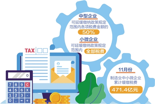 剛剛過去的11月是制造業(yè)中小微企業(yè)階段性稅收緩繳政策實(shí)施首月。12月1日,國家稅務(wù)總局發(fā)布統(tǒng)計數(shù)據(jù)顯示,這項(xiàng)政策實(shí)施效果顯著,制造業(yè)中小微企業(yè)已累計緩繳稅費(fèi)471.4億元。