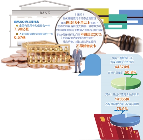 近年來,我國銀行業(yè)金融機(jī)構(gòu)信用卡業(yè)務(wù)快速發(fā)展,在便利群眾支付和日常消費(fèi)等方面發(fā)揮了重要作用。人民銀行發(fā)布的數(shù)據(jù)顯示,截至2021年三季度末,全國有信用卡和借貸合一卡7.98億張,人均持有信用卡和借貸合一卡0.57張。發(fā)卡量激增的同時(shí),行業(yè)亂象也被各界詬病,尤其是消費(fèi)者針對信用卡過度營銷、亂收費(fèi)等問題的投訴量近年來居高不下。