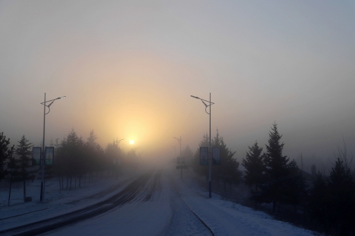 早晨7點30分,阿木爾林業(yè)局天剛蒙蒙亮,遠(yuǎn)處的群山不見了蹤影,籠罩在寒霧當(dāng)中,附近的建筑物影影綽綽,仿佛仙境一般,這種寒霧天氣被百姓成為“冒白煙”。