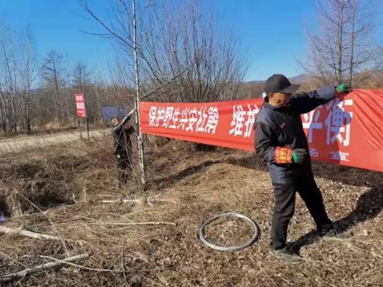 圖為新林林業(yè)局新林林場工作人員在懸掛保護(hù)野生興安杜鵑條幅(楊光 攝)