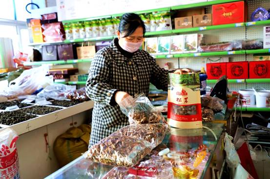 藍(lán)領(lǐng)山特產(chǎn)品店經(jīng)營業(yè)主高桂杰正在為客戶備貨。