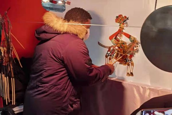 在望奎民間藝人表演的皮影戲現(xiàn)場,留學(xué)生們紛紛舉起手機(jī)拍照留念,并發(fā)出了陣陣贊嘆?!捌び笆怯皿H皮制作上色的,大家猜猜它是男生還是女生?”對外漢語系教師張明明帶領(lǐng)留學(xué)生來到皮影戲的后臺,講解皮影的制作工藝和皮影劇的來歷。留學(xué)生們被皮影戲深深吸引,聽得津津有味,并親自操作體驗(yàn)了一下。