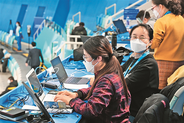 本報(bào)特派記者在冰絲帶現(xiàn)場(chǎng)寫稿。