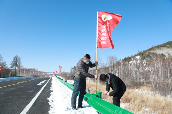 長山林場干部職工在G111國道安裝防火彩旗。(王力 攝)