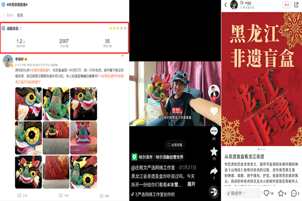 “黑龍江冰雪非遺盲盒”是省文旅廳在第二屆冰雪非遺節(jié)期間,依托黑龍江省豐富的非物質(zhì)文化遺產(chǎn)資源,推出的創(chuàng)意營銷活動(dòng)?;顒?dòng)期間,甄選了陳氏布藝、樺樹皮畫、剪紙、鰉魚等黑龍江非遺產(chǎn)品,涵蓋了藝術(shù)品、美食等多種品類,通過官方微博及微信公眾平臺(tái)策劃線上招募“非遺體驗(yàn)官”、非遺問答游戲等多種形式活動(dòng),隨機(jī)發(fā)放盲盒,充分展示了龍江非遺的獨(dú)特魅力。