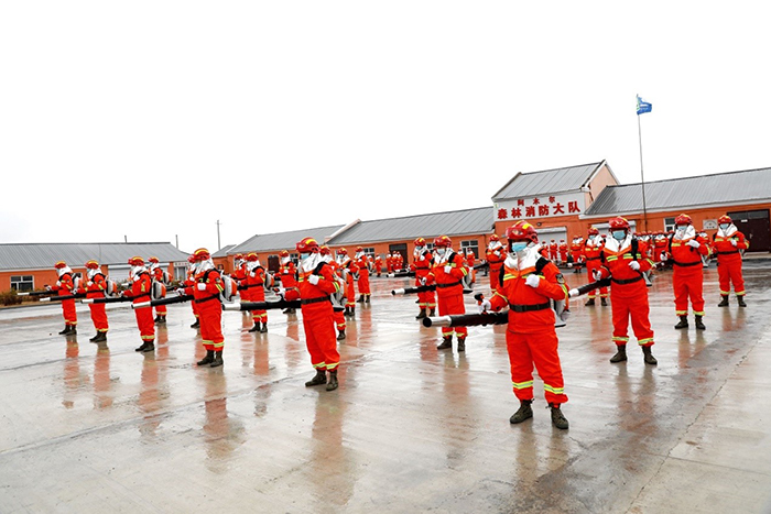 阿木爾林業(yè)局專業(yè)撲火隊員正在進(jìn)行風(fēng)力滅火機(jī)科目演練(王力 攝)