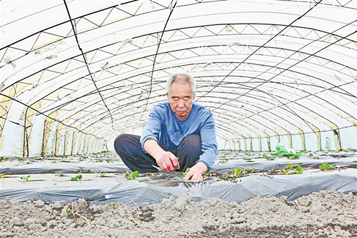 王明會在大棚內(nèi)侍弄著草莓秧,預(yù)計6月初草莓就可以上市了。孟大春 攝