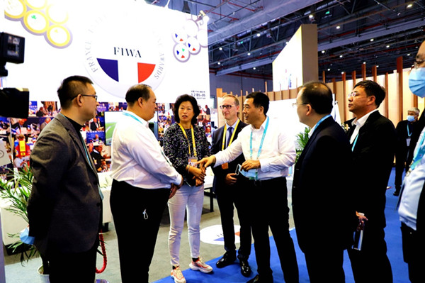 阿木爾林業(yè)局北極冰藍莓酒莊生產(chǎn)的冰酒、紅酒等產(chǎn)品,在第四屆上海國際進出口博覽會上展出。大興安嶺林業(yè)集團公司黨委副書記、總經(jīng)理李軍(左五)與國際友人及林業(yè)局參展人員親切交談,了解酒莊產(chǎn)品特點、市場營銷等情況(王力 攝)