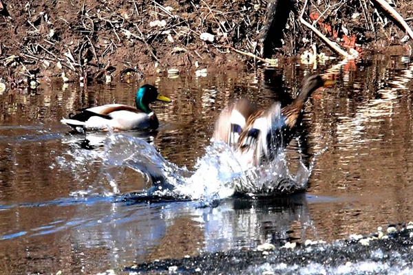 綠頭鴨“小夫妻”飛出水面瞬間(王力 攝)
