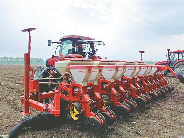 肇東市海城鎮(zhèn)靠山村千畝玉米示范園區(qū)內(nèi)大型耙地機(jī)、播種機(jī)、鎮(zhèn)壓機(jī)輪番上陣,冒雨作業(yè),不到4個(gè)小時(shí),570畝玉米地播種完畢。