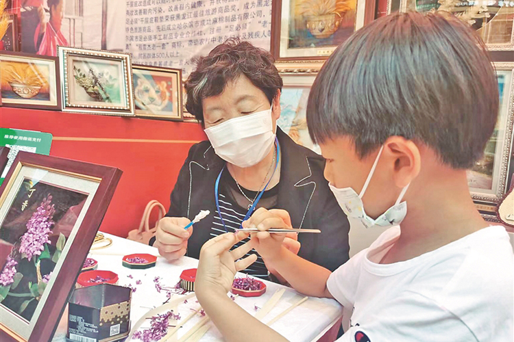國家級非遺項(xiàng)目——麥稈剪貼技藝傳承人馬文俠教孩子制作紫丁香。黑龍江日報(bào)全媒體記者 荊天旭攝