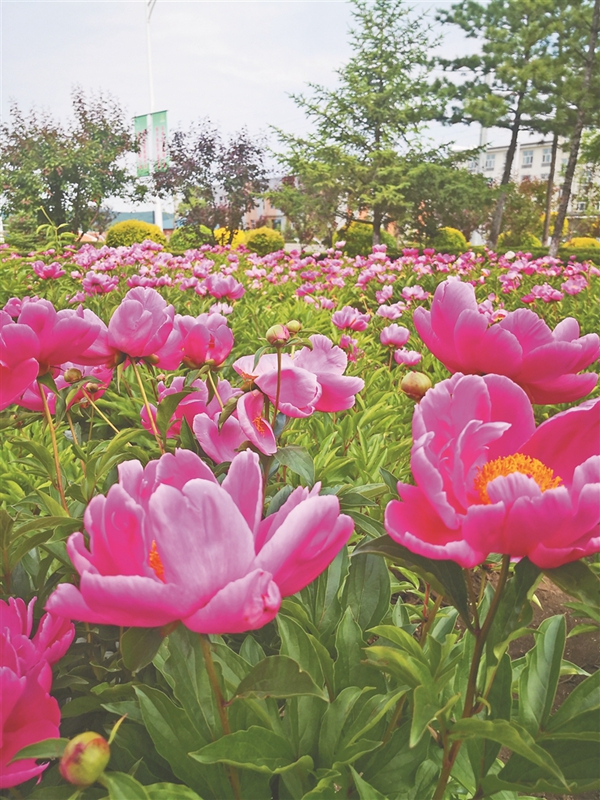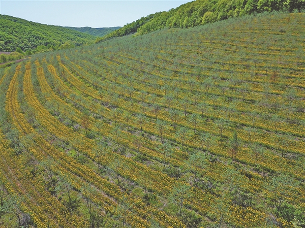 沿著公路,中藥材種植基地呈現(xiàn)一片花海:大片芍藥已經(jīng)開花,白的粉的隨風飄搖;千畝黃芩都已經(jīng)3歲,仿佛綠蘿緞一直蔓延到遠方的山坡;萬畝沙棘谷,更像一幅水墨畫,剛露頭的沙棘果盡顯萌態(tài);樹下間作的蒲公英盛開著黃色的小花;紫的泛黑的藍靛果吸引一群群鳥兒不停來啄食……