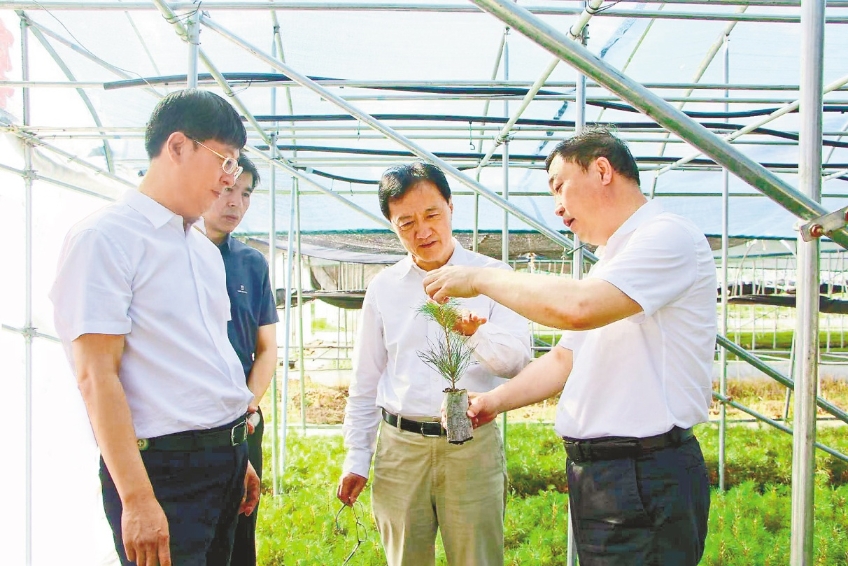 翟青(中)在伊春森工集團公司紅松種苗繁育基地調(diào)研(劉博/攝)。