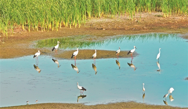 “此次現(xiàn)身的東方白鸛數(shù)量有近百只,且已在濕地停留10余日。以往東方白鸛只有在春秋遷徙季節(jié)才經(jīng)停安邦河濕地,在這個(gè)季節(jié)現(xiàn)身,屬史上首次。”安邦河濕地自然保護(hù)區(qū)管理局旅游科科長(zhǎng)王偉介紹。