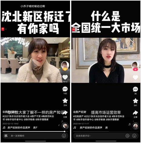 “現(xiàn)在整個(gè)沈陽房產(chǎn)市場30%的成交額都是由快手主播提供的,當(dāng)?shù)氐拈_發(fā)商們也會(huì)經(jīng)常和快手平臺(tái)、快手主播合作宣傳,平臺(tái)對(duì)于房產(chǎn)行業(yè)的約束,也帶著當(dāng)?shù)胤慨a(chǎn)市場向更加正規(guī)化方向發(fā)展”。