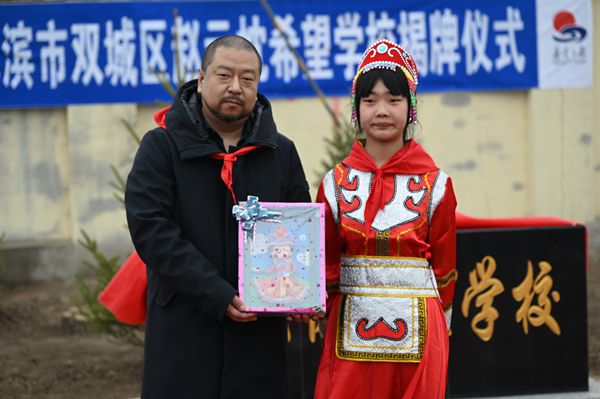 儀式中,農(nóng)豐滿族錫伯族鎮(zhèn)黨委書記李雪柏為張博先生頒發(fā)榮譽獎牌,以及學(xué)生精心制作的手工禮物,表達真誠的感激之情。