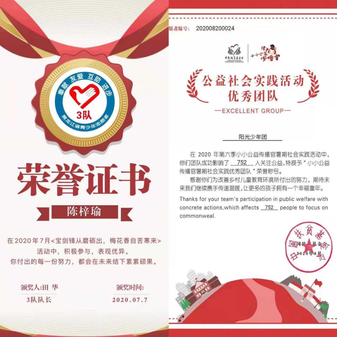 她在志愿服務(wù)中不怕苦不怕累,圓滿完成各項(xiàng)任務(wù),獲得各界一致好評(píng),先后獲得省市(區(qū))的相關(guān)表彰,并被省幫扶中心授予“愛(ài)心少年”榮譽(yù)稱號(hào)。