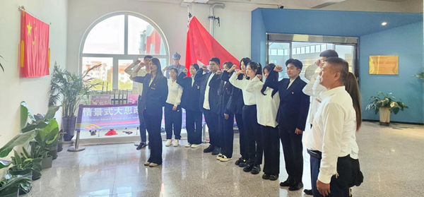 在課程結(jié)束之際,少先隊(duì)員發(fā)出了“勿忘國恥 吾輩自強(qiáng)”的錚錚誓言;黑龍江外國語學(xué)院藝術(shù)系輔導(dǎo)員張博雅帶領(lǐng)在場全體黨員重溫了入黨誓詞。短短的十二句話,道出了中國共產(chǎn)黨的百年奮斗歷程,凝聚著每一名黨員不忘初心、堅(jiān)守理想的信念與力量。面對黨旗,全體黨員莊嚴(yán)地舉起右拳宣誓,表達(dá)了矢志不渝跟黨走的決心和勇?lián)姑?、不?fù)黨恩的堅(jiān)定信念。