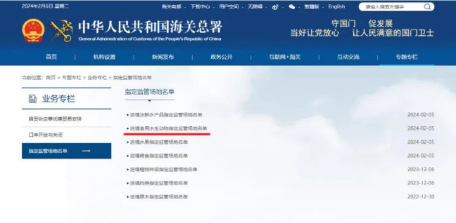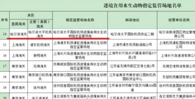 2023年12月14日-15日,海關總署專家組對哈爾濱太平國際機場進境食用水生動物指定監(jiān)管場地進行驗收。2月5日海關總署公告正式通過驗收。
