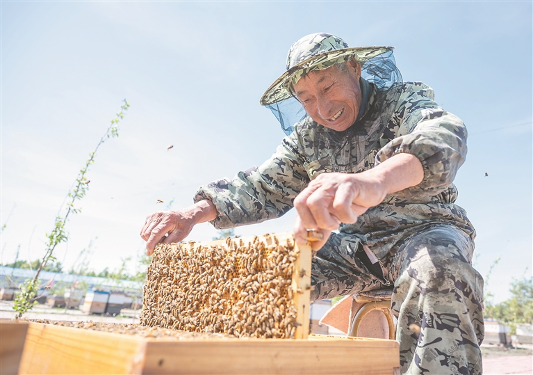 盛夏,草木蔥蘢、百花盛開,正是蜜蜂采蜜的好時節(jié)。走進(jìn)齊齊哈爾市克東縣東興林場,上百箱規(guī)格統(tǒng)一的木質(zhì)蜂箱整齊排列,蜂箱周圍,勤勞的蜜蜂們正忙碌地搬運(yùn)著甜蜜果實(shí),發(fā)出嗡嗡的聲響。