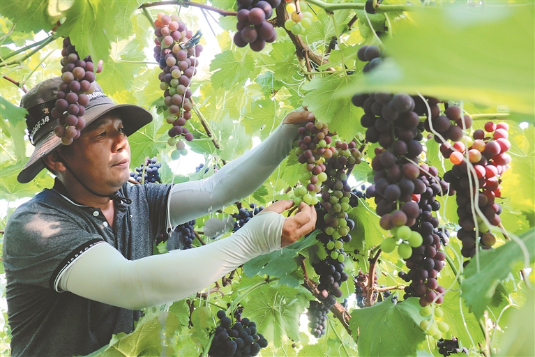 “春棚栽培的葡萄在8月中旬成熟,而在暖棚里,由于溫度、濕度得到科學(xué)精準(zhǔn)控制,葡萄成熟得更早,產(chǎn)量更高。7月10日左右即可上市,搶占市場空缺?!笔卟斯矩?fù)責(zé)人王軍強(qiáng)邊說一邊拿起手機(jī)拍攝,為一周后葡萄上市進(jìn)行宣傳。