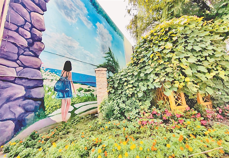 哈爾濱市道外區(qū)東直路上,路邊的花卉景觀與墻體彩繪互相映襯,成為街頭一道美麗風(fēng)景,引得人們紛紛駐足觀看。畫里的溪流、小徑、樹(shù)木、花草、動(dòng)物與畫外的綠地巧妙結(jié)合起來(lái),融為一個(gè)整體,創(chuàng)意新穎,視覺(jué)效果良好,讓人眼前一亮。