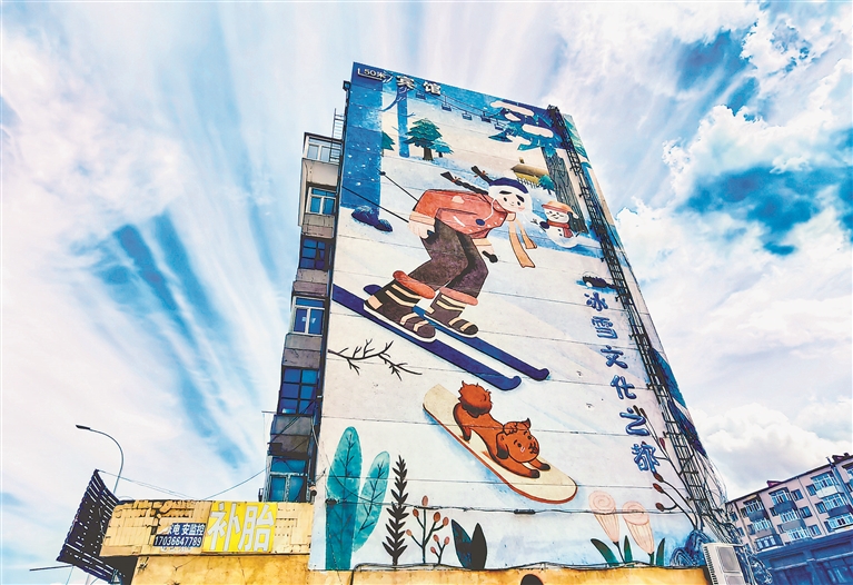 道外區(qū)火車頭街附近,一棟7層樓的外墻上繪制了滑雪運(yùn)動(dòng)的場(chǎng)景,吸引許多路人觀看;北馬路附近,一棟老樓的紅磚外墻也進(jìn)行了彩繪,巨大的圖畫為當(dāng)?shù)卦鎏砹艘坏烂谰啊?/span>本報(bào)記者 蘇強(qiáng)攝