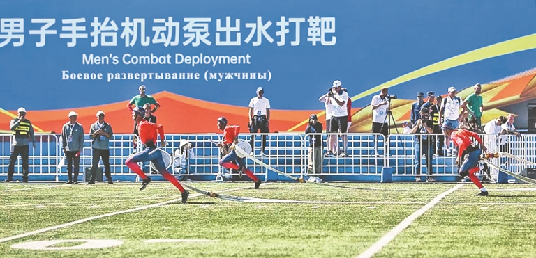 手抬機(jī)動(dòng)泵出水打靶比賽為團(tuán)體項(xiàng)目,由7名運(yùn)動(dòng)員組隊(duì)參賽,需要運(yùn)動(dòng)員通力協(xié)同,首先快速啟動(dòng)水泵,同步連接吸水管、濾水器等進(jìn)行吸水供水,然后沿水泵與標(biāo)靶之間,依次完成3盤干線水帶、1個(gè)分水器、4盤支線水帶的連接任務(wù),最后2名水槍手連接水槍,跪姿射水,直擊靶心。當(dāng)注水達(dá)10升時(shí),指示燈閃爍,停止計(jì)時(shí),完成比賽。