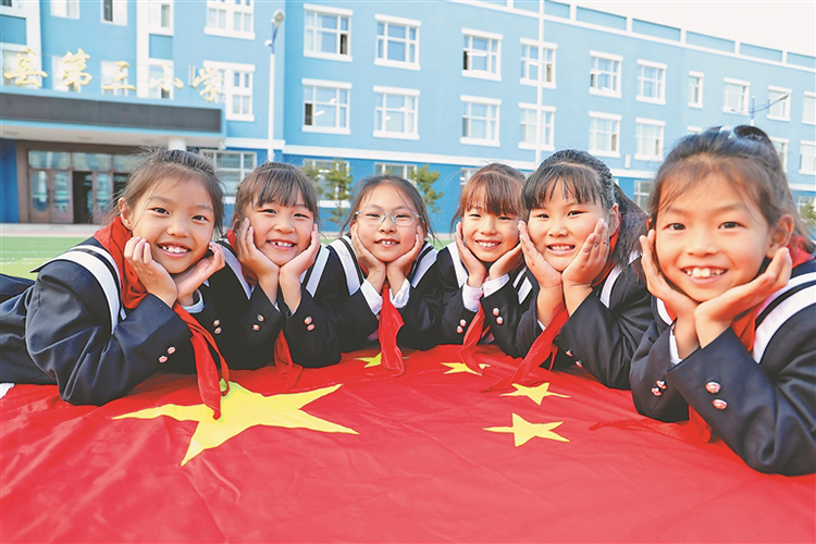 呼瑪縣第二、第三小學的孩子們和國旗合影。本報記者 郭俊峰攝