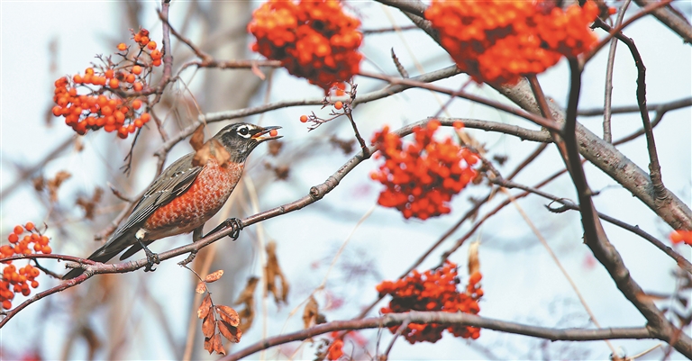 近日,幾只“小精靈”在哈爾濱市音樂公園的花楸樹叢被市民拍到。經(jīng)過東北林業(yè)大學(xué)野生動物與自然保護地學(xué)院教授許青等鳥類專家對比辨認,確認這種鳥為來自美洲大陸的候鳥旅鶇。連日來,各地觀鳥人紛至沓來,守在樹旁拍攝、觀賞。