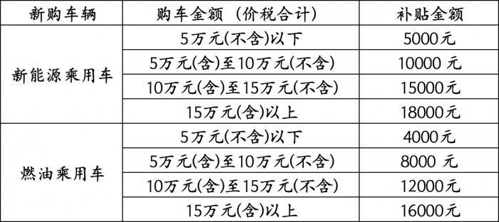 按《通知》要求,新補(bǔ)貼標(biāo)準(zhǔn)分為四檔。新購(gòu)車(chē)輛為新能源乘用車(chē)的,發(fā)票金額在5萬(wàn)元(不含)以下,每輛車(chē)補(bǔ)貼5000元;5萬(wàn)元(含)至10萬(wàn)元(不含),每輛車(chē)補(bǔ)貼10000元;10萬(wàn)元(含)至15萬(wàn)元(不含),每輛車(chē)補(bǔ)貼15000元;15萬(wàn)元(含)以上,每輛車(chē)補(bǔ)貼18000元。新購(gòu)車(chē)輛為燃油乘用車(chē)的,5萬(wàn)元(不含)以下,每輛車(chē)補(bǔ)貼4000元;5萬(wàn)元(含)至10萬(wàn)元(不含),每輛車(chē)補(bǔ)貼8000元;10萬(wàn)元(含)至15萬(wàn)元(不含),每輛車(chē)補(bǔ)貼12000元;15萬(wàn)元(含)以上,每輛車(chē)補(bǔ)貼16000元。