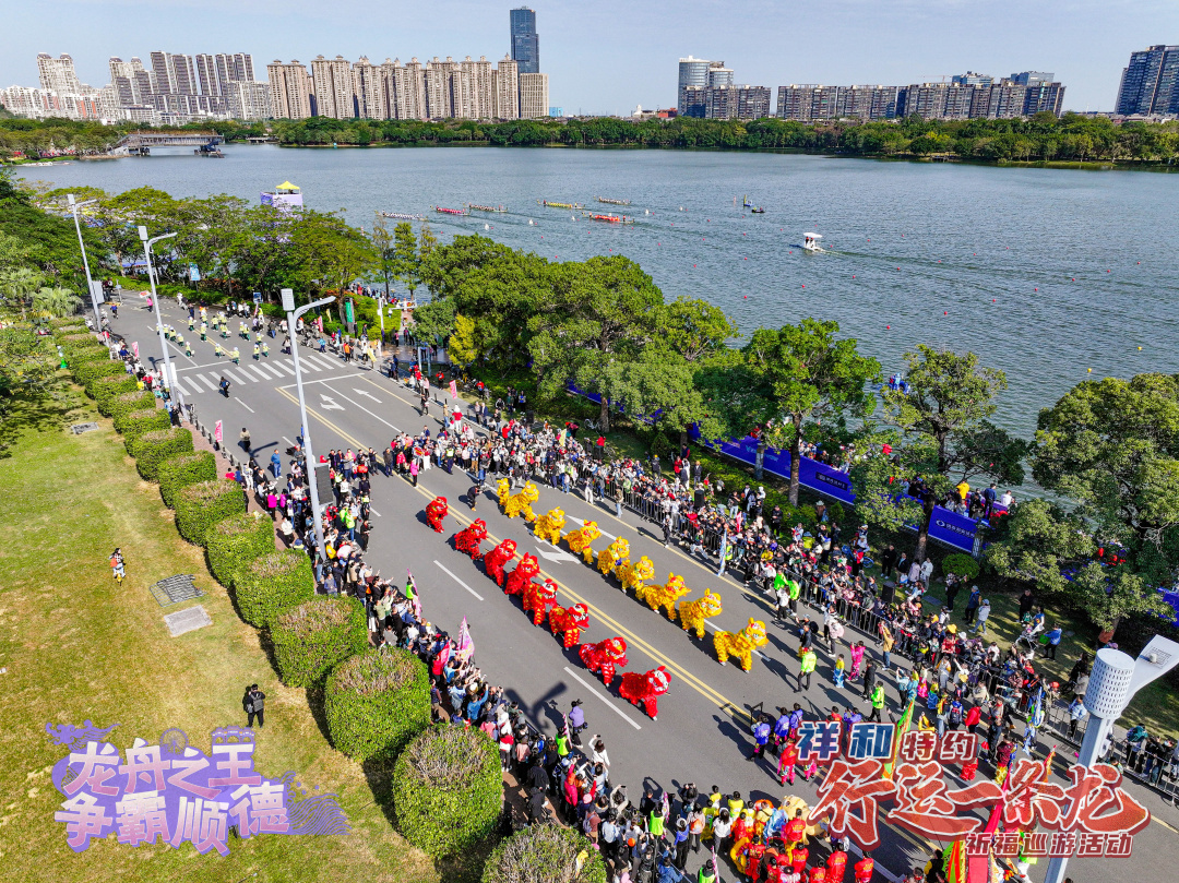 桂畔湖上觀競(jìng)渡,順峰山下接龍福。12月8日,陽(yáng)光明媚,天朗氣清,水上,來(lái)自全國(guó)各地的龍舟勁旅齊聚順德,展開水上競(jìng)逐;岸邊,薈萃順德十鎮(zhèn)街龍文化元素的“文化巨龍”,開啟4.5公里的精彩巡游。