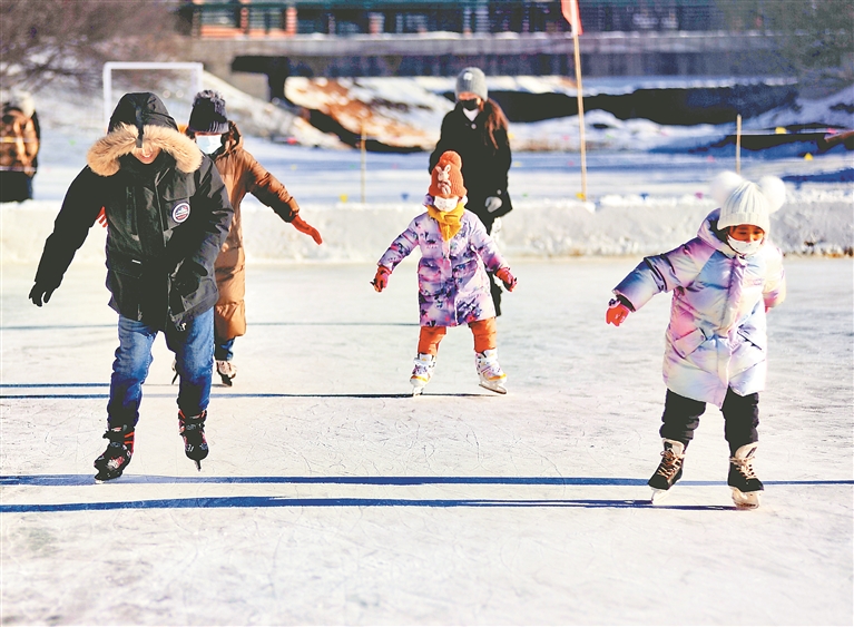 近日,哈爾濱市道里區(qū)群力體育公園公益冰場(chǎng)內(nèi),許多人在練習(xí)滑冰。