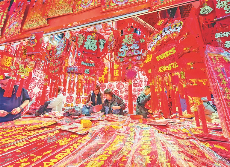 春節(jié)臨近,哈爾濱市道里區(qū)一處批發(fā)市場內(nèi),市民們正在購買各種節(jié)日飾品,用來裝點家居,迎接新春佳節(jié)的到來。蛇年主題的燈籠、對聯(lián)、福字等擺滿了柜臺,紅紅火火,喜慶氣氛濃厚。人們臉上都洋溢著幸福的笑容,一邊逛一邊買,個個滿載而歸。