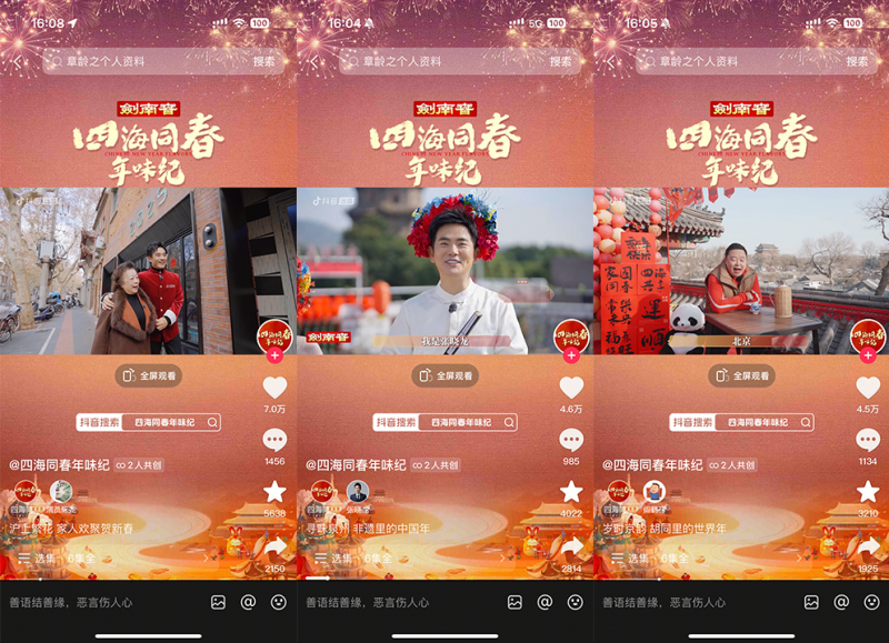 為紀念首個“非遺版春節(jié)”,由抖音出品、中國名酒劍南春冠名的春節(jié)主題紀錄片《四海同春年味紀》邀請多位明星來到家鄉(xiāng)或向往的城市,體驗當?shù)靥厣晡丁<o錄片于1月22日-1月27日,通過抖音、抖音精選、今日頭條、西瓜視頻、鮮時光等平臺播出。截至收官,該片正片播放量超1億,抖音話題播放量破2.3億,全網(wǎng)曝光達10億,相關(guān)話題多次登上平臺熱榜。