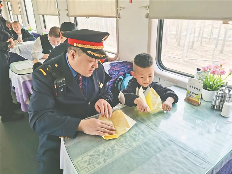 本報(bào)訊(張蔚萌 王夢 記者 王迪)近日,由鄭州開往海拉爾的K927次列車從昌圖站駛出后,列車長孫志強(qiáng)接到12306轉(zhuǎn)發(fā)的緊急尋人求助工單。經(jīng)過與客服溝通了解后得知,旅客劉玲玲帶6歲兒子劉俊澤從沈陽北站乘車至昌圖站,因下車時(shí)忙于整理行李,將座位上熟睡的孩子遺落在列車上。列車長孫志強(qiáng)通過對(duì)講機(jī)立即組織各節(jié)車廂列車員尋找孩子,確定孩子位置后迅速趕到現(xiàn)場。為了緩解孩子的緊張情緒,他化身“臨時(shí)爸爸”,將孩子帶到了餐車,不僅準(zhǔn)備了一些自帶的小零食,還陪孩子一起折紙飛機(jī)。當(dāng)列車停靠長春站后,孫志強(qiáng)按照其母親劉玲玲的要求,將孩子安全移交給長春站工作人員,等待其家屬前來接領(lǐng)。