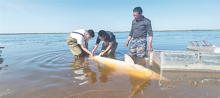 在黑龍江省水生動物資源養(yǎng)護中心技術人員的精心救治與蘿北縣和遜克縣漁政部門的協(xié)同努力下,這兩尾達氏鰉完成救治后,被及時放歸黑龍江干流蘿北段、遜克段,重歸自然。