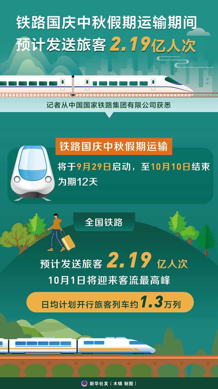 新華社北京9月28日電(記者樊曦)記者從中國國家鐵路集團(tuán)有限公司獲悉,鐵路國慶中秋假期運(yùn)輸將于9月29日啟動,至10月10日結(jié)束,為期12天,全國鐵路預(yù)計(jì)發(fā)送旅客2.19億人次,10月1日將迎來客流最高峰,日均計(jì)劃開行旅客列車約1.3萬列。
