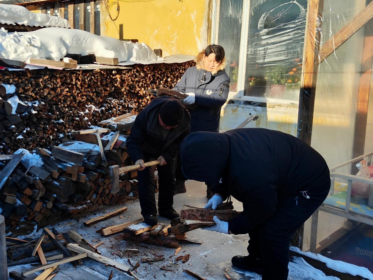 林場黨員先鋒隊(duì)隊(duì)員幫助困難職工準(zhǔn)備取暖燒柴(陶文玲 攝)