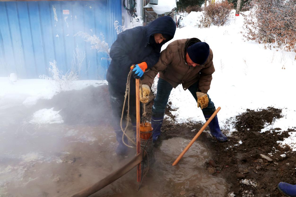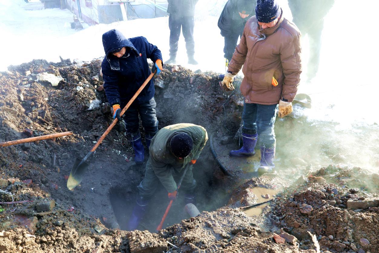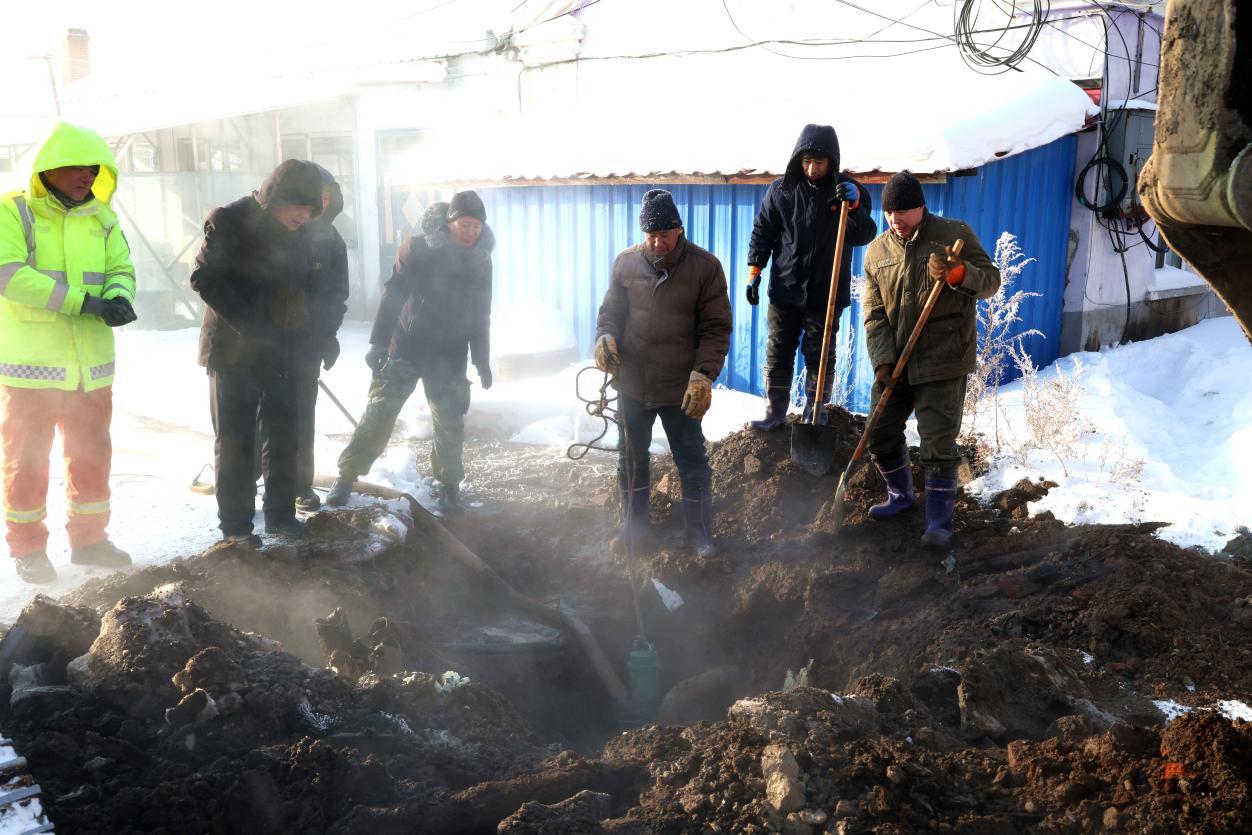 當(dāng)日早8時(shí)許,物業(yè)公司巡線員巡查時(shí)發(fā)現(xiàn)西華路平房區(qū)地面冒熱水,立即上報(bào)并啟動(dòng)搶修預(yù)案。7名搶修人員火速趕赴現(xiàn)場(chǎng),現(xiàn)場(chǎng)分工明確、緊張有序,有的安裝水泵排水,有的接駁應(yīng)急電源,有的揮鎬刨挖凍土層,同時(shí)調(diào)配小型挖溝機(jī)輔助作業(yè)。